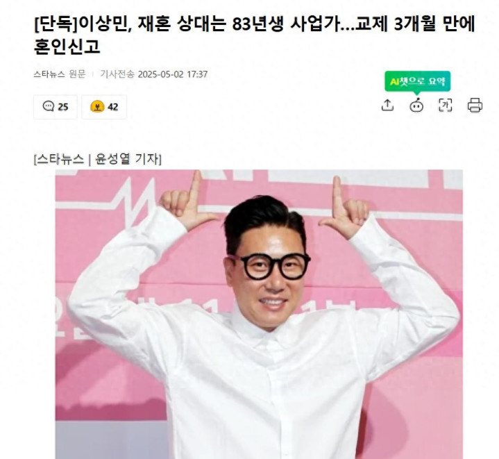 回顾李尚敏的感情经历,他曾于2004年与演员兼画家李惠英结婚,但婚姻仅维持一年便宣告结束。此后,他因事业失败背负巨额债务,但凭借努力在去年终于还清所有欠款。如今,离婚20年的他再次找到幸福,粉丝们也纷纷送上祝福。